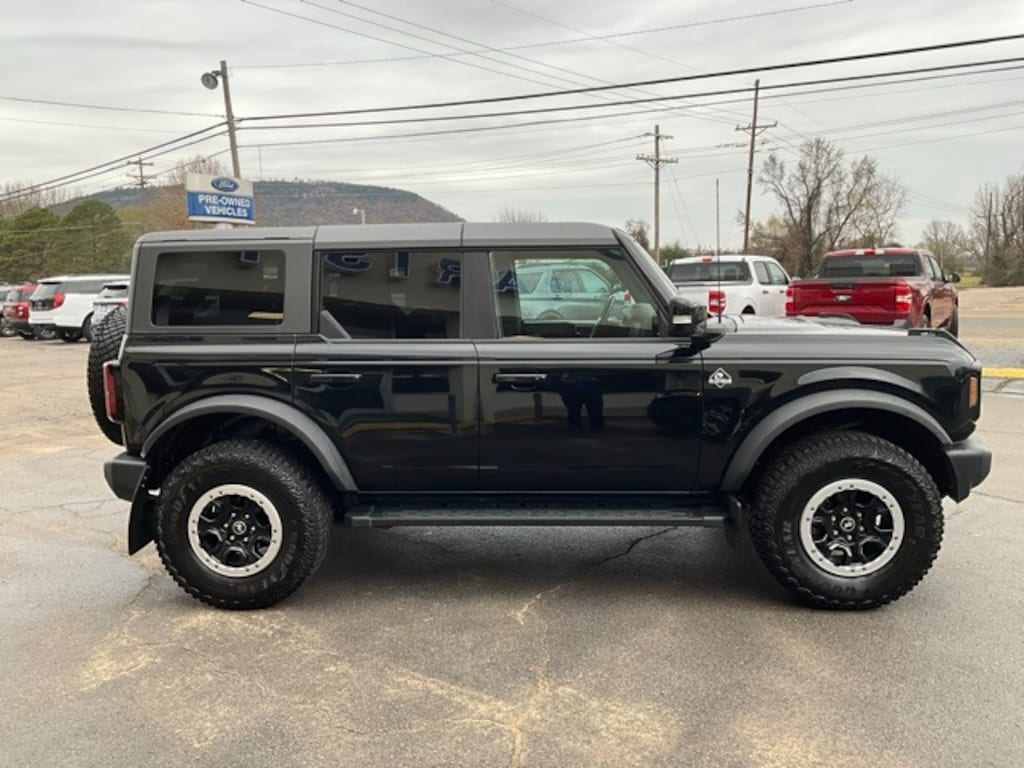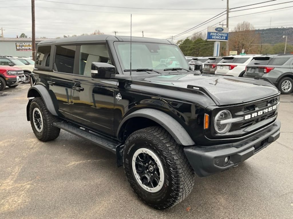 Shadow Black 2023 Ford Bronco Outer Banks 4WD 10-Speed Automatic 2.7L EcoBoost V6 10 Speakers w/Subwoofer, 12" LCD Capacitive Touchscreen w/Swipe Capability, 2 Smart Charging USB Ports In Dashboard, 360-Degree Camera, ABS brakes, Adaptive Cruise Control, Additional Sound Deadening, Compass, Connected Built-In Navigation, Electronic Stability Control, Equipment Group 314A Lux Package, Evasive Steering Assist, Front Parking Sensors, Heated door mirrors, Heated Leather-Trimmed/Vinyl Bucket Seats, Heated Steering Wheel, Illuminated entry, Information on Demand Panel, Low tire pressure warning, Radio: B&O Sound System by Bang & Olufsen, Remote keyless entry, Sideview Mirrors, Traction control, Universal Garage Door Opener, Wireless Charging Pad.